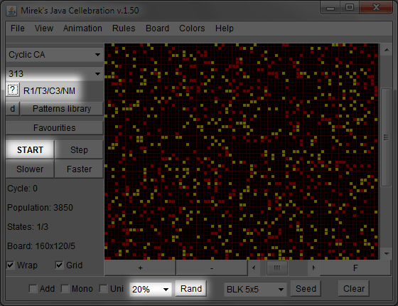 Three elements are highlighted in the example screen capture of the applet. The applet will load rule 313 from the Cyclic CA family. This is represented near the question-mark button (?) using the notation R1/T3/C3/NM.